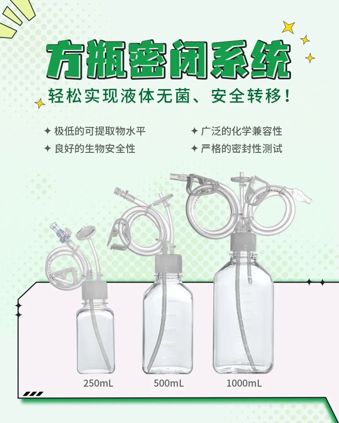 潔特生物新推出培養基方瓶密閉轉移系統,可用于細胞治療、基因治療、抗體和疫苗等生物藥研發生產過程中的液體轉移,可實現全封閉式無菌液體轉移,最大程度降低污染風險!