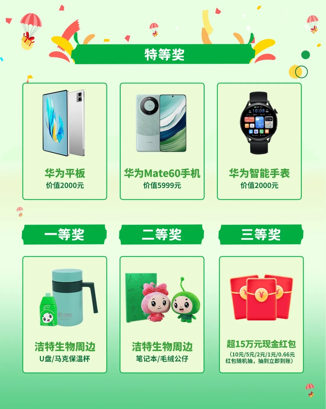 購買潔特生物細胞培養(yǎng)板、細胞培養(yǎng)瓶,開箱就能掃碼抽獎!每箱活動產品含有1~4個抽獎二維碼,如果您購買了一箱活動產品,您將獲得最多4次抽獎機會哦!中獎率高達90%以上!可以瓜分15萬元紅包池,更有華為Mate60手機/平板/手表、潔特生物周邊等你抱回家!