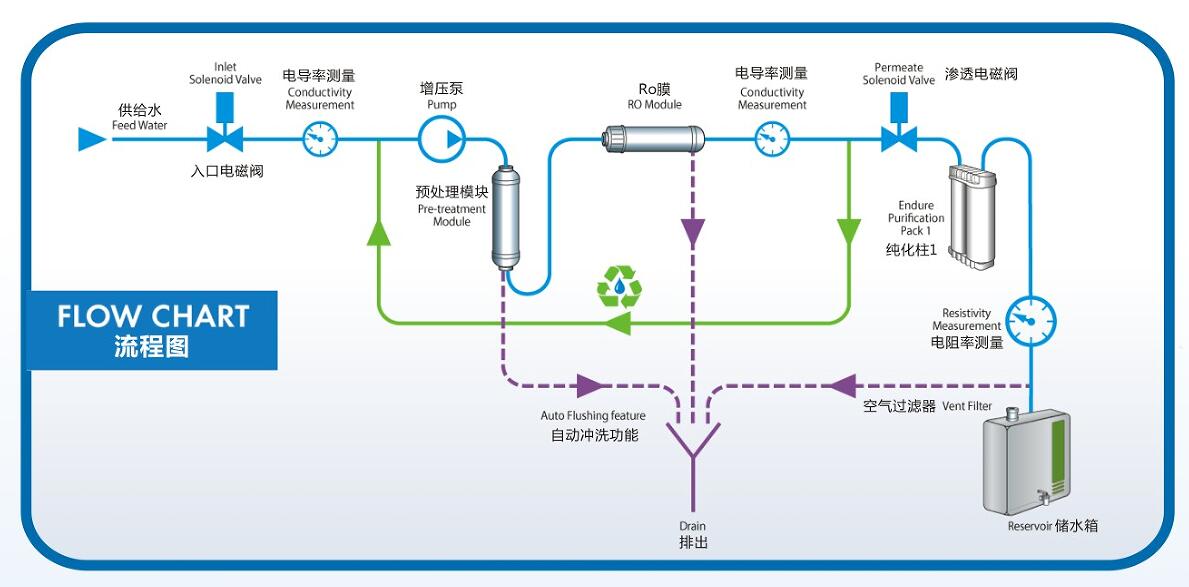 在RO純化過程中,不符合要求的水并未流入下一個純化環節,而是重新回流至RO步驟中繼續反滲透,只有達到標準的水才能進入DI環節進行去離子純化。因此,DI耗材包只接觸到了純凈的RO水,一定程度上增加了其使用壽命。